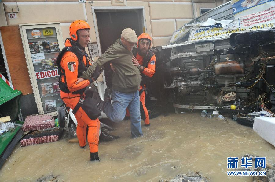 11月4日,在意大利北部城市熱那亞,消防員幫助一名男子撤離被洪水圍困的地區。意大利北部城市熱那亞4日遭暴雨襲擊,在部分城區引發洪水,已導致7人死亡。 新華社/路透
