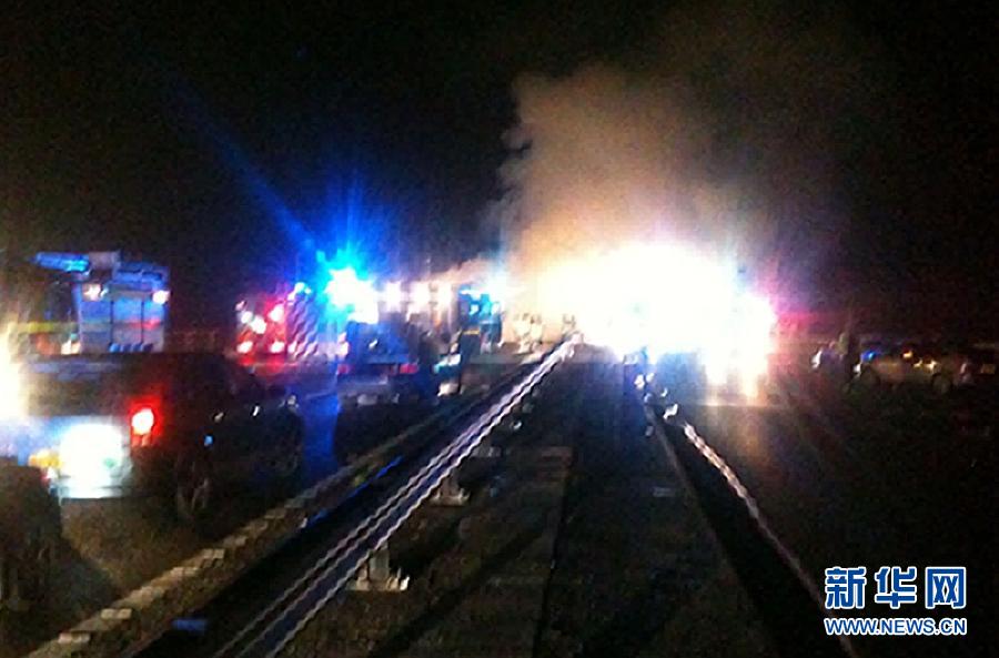 這張11月5日由警方發布的照片顯示,11月4日,在英國英格蘭西南部地區靠近薩默塞特郡布里奇沃特鎮的M5高速公路上發生的連環撞車事故引起大火,并發生爆炸。這里4日晚發生連環撞車事件,致數人死亡、大約35人受傷。撞車引發大火、爆炸,20多輛汽車和卡車損毀。撞車原因尚不清楚,但事發地附近接連幾天遭遇暴雨、濃霧天氣。新華社/法新
