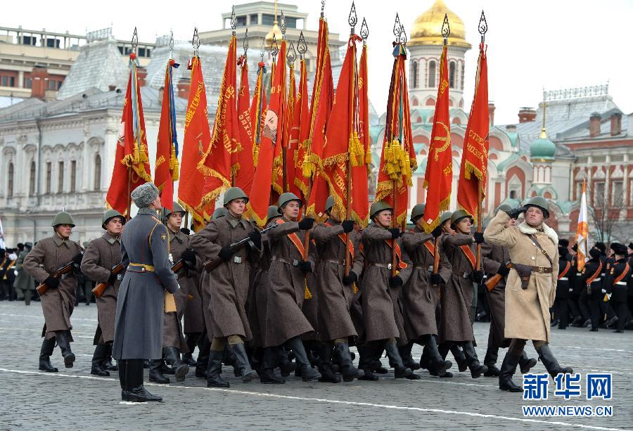 11月7日,身著二戰時期蘇軍制服的士兵走過紅場。當日,莫斯科舉行盛大游行,紀念具有傳奇色彩的1941年紅場閱兵。1941年11月7日,在德國法西斯軍隊兵臨莫斯科城下之際,蘇聯軍隊在紅場上舉行了閱兵式,參加部隊在閱兵完畢后直接開赴前線作戰。新華社記者姜克紅攝