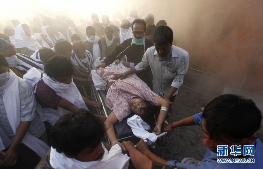 12月9日,在印度加爾各答,救援人員用擔架將一名病人從失火醫院中抬出。