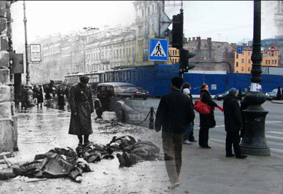 拉仁科夫介紹,他從檔案館和網上搜尋到二戰時期的老照片,并通過ps技術,將這些黑白照片和同一地點拍攝的現代日常照片整合到一起。這個過程很簡單,效果卻非常驚人:納粹德軍的鐵蹄踏上人來人往的現代馬路;行色匆匆的上班族與扛槍的士兵擦身而過;戰爭死難者的尸體凄涼地倒在繁華的現代都市街頭……這些照片仿佛開啟了一扇二戰時期的“時空之窗”,給人一種異樣的穿越之感。