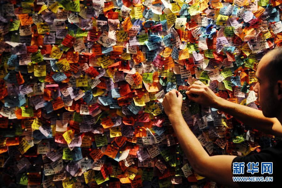 12月29日,工作人員將人們填寫好的心愿紙片貼到美國(guó)紐約時(shí)報(bào)廣場(chǎng)的心愿墻上。 2012年來臨之際,紐約時(shí)報(bào)廣場(chǎng)咨詢中心內(nèi)專門設(shè)立了一面心愿墻,來自世界各地的游客都可以將寫有自己新年美好心愿的五彩紙片貼到上邊。所有的紙片將被收集起來,在2012年新年鐘聲敲響之際,從時(shí)報(bào)廣場(chǎng)上空飄散而下。新華社記者申宏攝