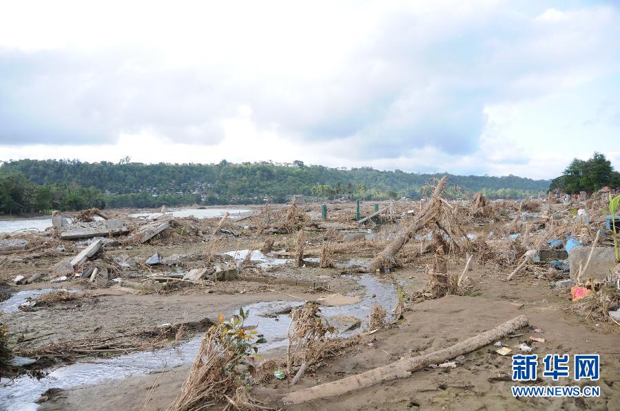 在菲律賓南部棉蘭老島卡加延-德奧羅市,卡加延-德奧羅河旁的一個村莊被熱帶風暴“天鷹”帶來的洪水沖得蕩然無存(12月30日攝)。新華社記者譚衛兵攝