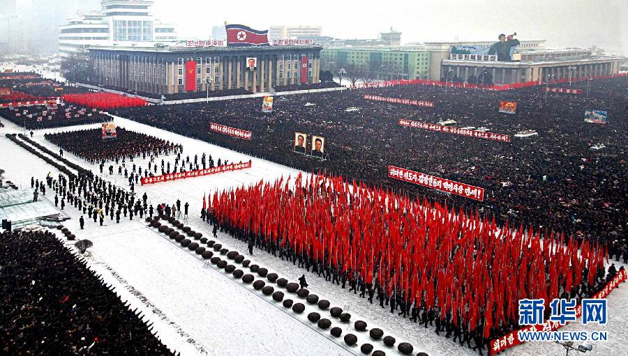 朝中社1月3日提供的照片顯示,平壤市3日在金日成廣場舉行群眾集會,決心貫徹朝鮮勞動黨中央政治局決議、黨中央委員會和黨中央軍事委員會發布的共同口號以及新年聯合社論精神。新華社/朝中社