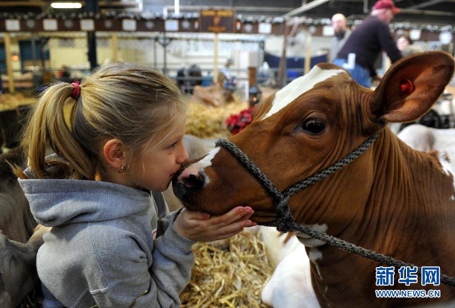 1月12日,在美國賓夕法尼亞州首府哈里斯堡市舉行的農場秀上,一名名叫格雷西的女孩親吻她喂養的奶牛。一年一度的賓夕法尼亞州哈里斯堡農場秀是美國大型室內農業展,至今已經舉辦了96屆。今年的農場秀薈萃了6000多頭家畜和290多個與農產品相關的農業展攤,包含了千余項農業趣味競賽,吸引了全美各地40萬觀眾參觀,展示了美國豐富多樣的農業特色和傳統的農業畜牧業文化。新華社記者王雷攝