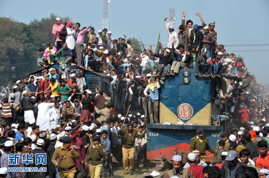 1月15日,穆斯林民眾在朝覲集會結束后登上超載的火車,離開孟加拉國首都達卡附近的城鎮東吉。 新華社發(謝里夫·伊斯拉姆攝)