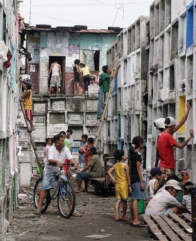 馬尼拉北部墓地是菲律賓全國最大的墓地,同時這里生活著成千上萬的菲律賓窮人。位于諾特區的這處公共墓地并不沉寂陰森,每天人聲嘈雜,熱鬧無比,形成了菲律賓特色的墓地貧民窟。官方透露,在馬尼拉有5萬窮人住在各處墓地。