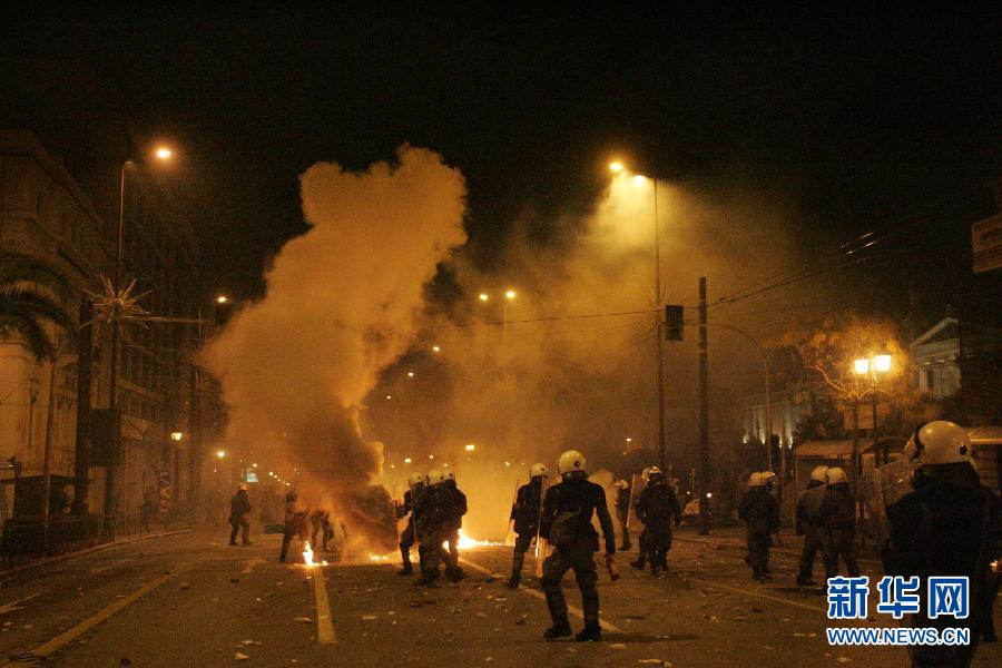 2月12日,在希臘首都雅典,示威者與警察發生沖突。當天,希臘議會正對希政府與歐盟和國際貨幣基金組織等達成的新救援協議進行辯論時,數萬名希臘民眾聚集在位于雅典市中心的憲法廣場示威,反對實施新一輪緊縮措施。新華社發(馬里奧斯·羅洛斯攝)