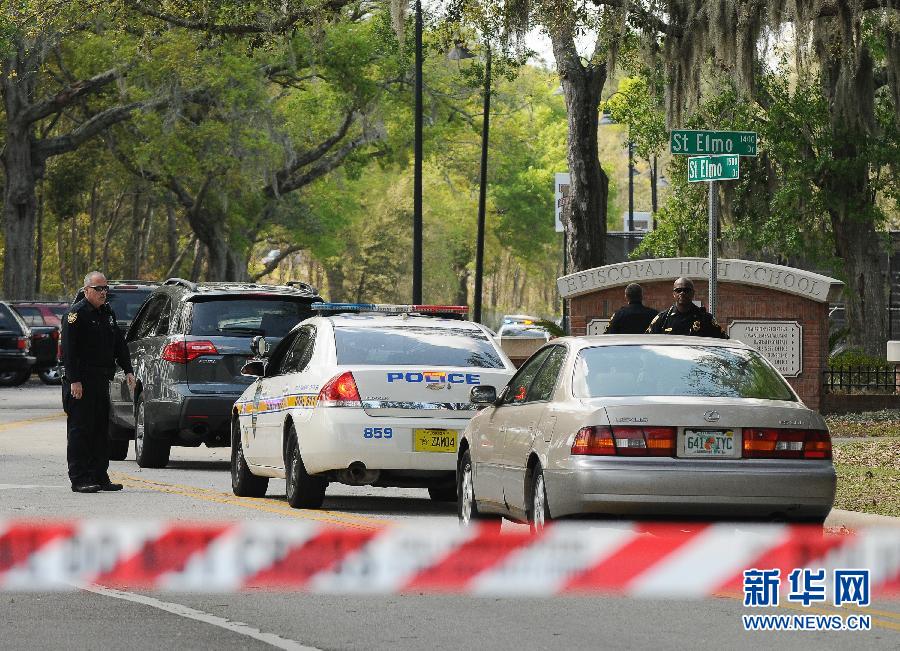 3月6日,在美國佛羅里達州杰克遜維爾市,當地治安官在發生槍擊案的學校附近疏導交通。杰克遜維爾市一所高中當天發生槍擊事件,造成2人死亡,原因仍在調查中。 新華社/美聯