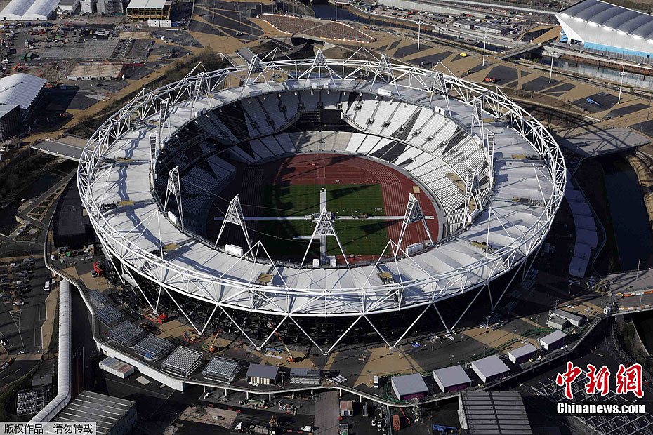 7月23日,英國倫敦奧運會即將開幕,為奧運而建的各個場館現已基本準備就緒。圖為3月27日從飛機上拍攝的倫敦奧運會開閉幕式體育場。