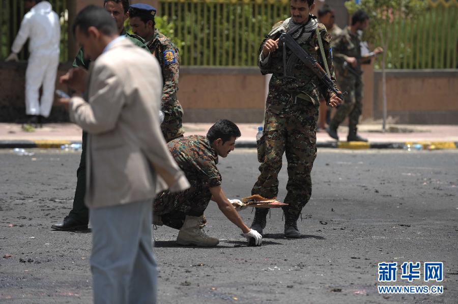 5月21日,在也門首都薩那,也門安全部隊人員在爆炸現場清理殘骸。