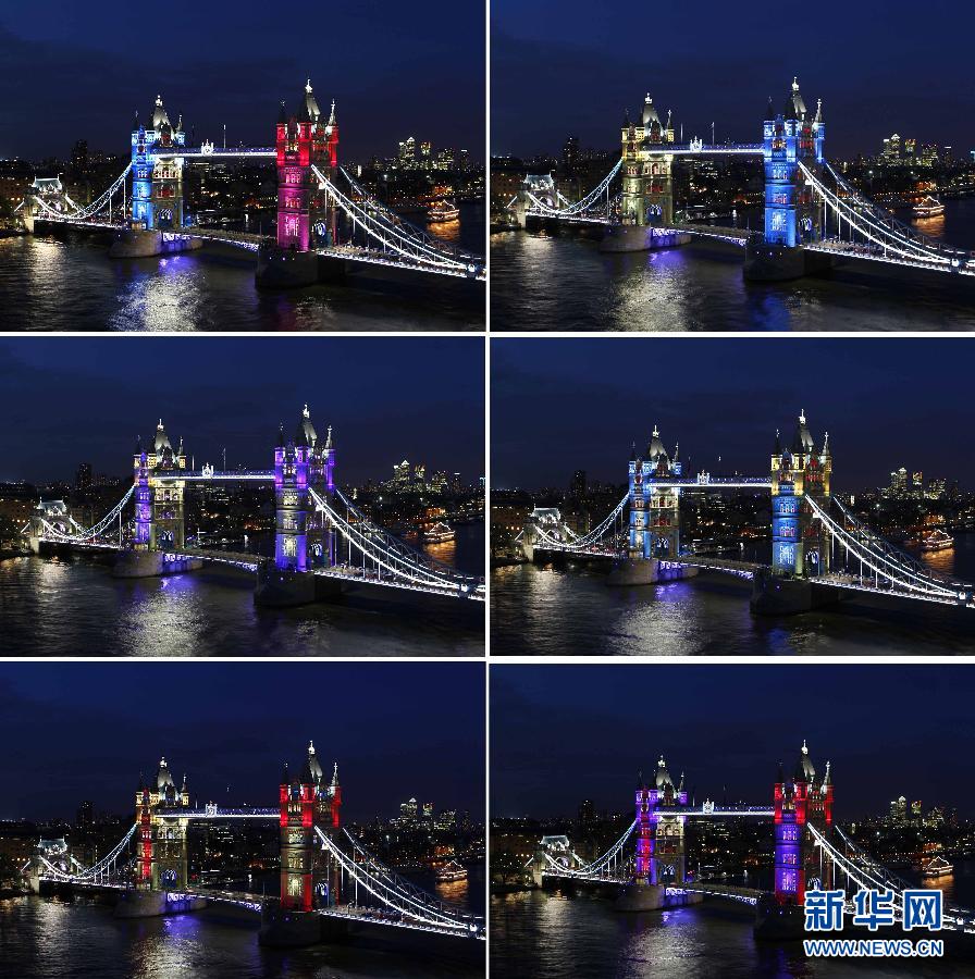 這張拼版照片顯示,5月30日,英國倫敦泰晤士河上的倫敦塔橋展示新燈光效果。當天,為慶祝英國女王登基60周年和倫敦奧運會的到來,倫敦塔橋上的照明系統在經過6個月的整修后首次亮燈,塔橋上的魔幻燈光效果使倫敦夜景更加迷人。新華社記者殷剛攝