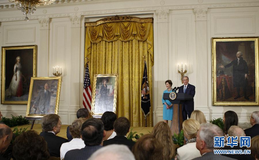 5月31日,在美國首都華盛頓,美國前總統喬治·W·布什在白宮舉行的他本人及夫人的畫像揭幕儀式上致辭。當日,美國前總統喬治·W·布什及夫人勞拉的畫像正式入駐白宮,畫像揭幕儀式由現任總統貝拉克·奧巴馬主持。繪制和懸掛總統畫像是白宮一項傳統。新華社記者方喆攝