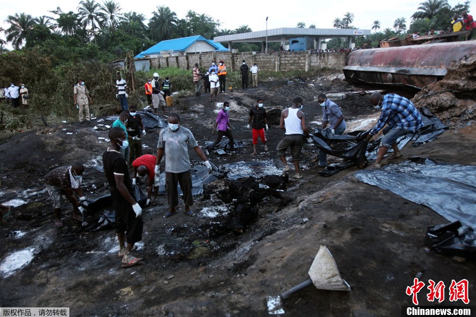 當(dāng)?shù)貢r(shí)間2012年7月12日,尼日利亞哈科特港,一輛運(yùn)送汽油的車(chē)輛發(fā)生事故并引發(fā)大火,目前已造成至少95人死亡。圖為救援人員在搬運(yùn)遇難者。