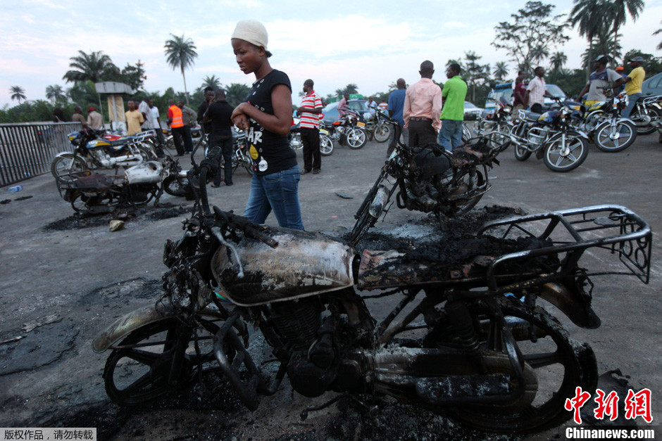 當(dāng)?shù)貢r(shí)間2012年7月12日,尼日利亞哈科特港,一輛運(yùn)送汽油的車(chē)輛發(fā)生事故并引發(fā)大火,目前已造成至少95人死亡。圖為人們從被燒毀的摩托車(chē)旁經(jīng)過(guò)。