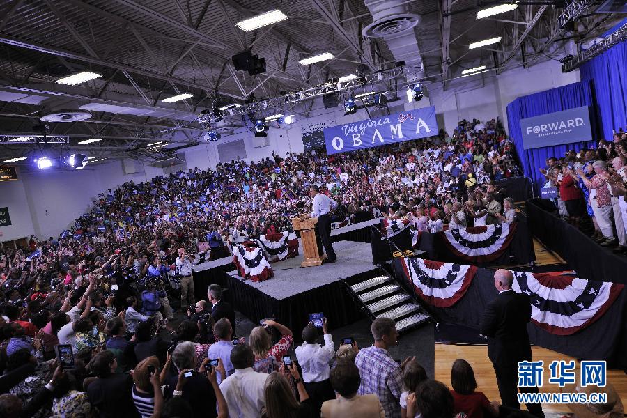 7月13日,在美國弗吉尼亞州東南部弗吉尼亞比奇,美國總統奧巴馬舉行競選造勢活動。在決定美國總統選舉的“搖擺州”之一弗吉尼亞州,奧巴馬連續兩天開展5場競選集會,以爭取競選優勢。