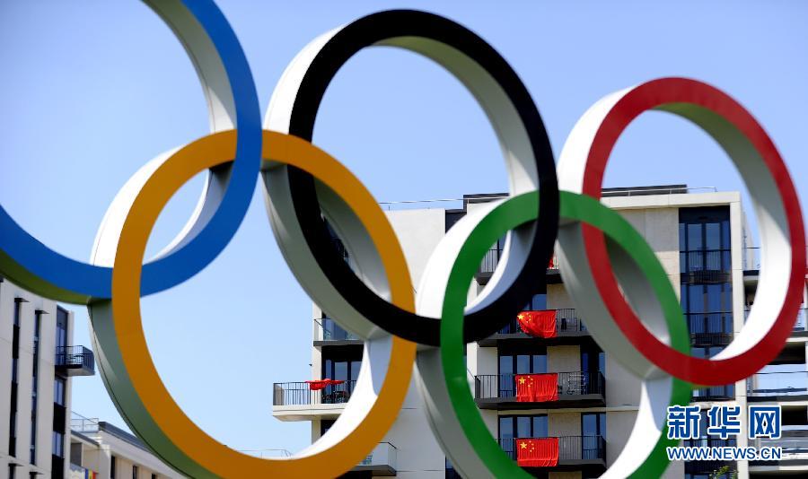 圖為7月24日拍攝的掛在奧運村宿舍陽臺上的國旗。