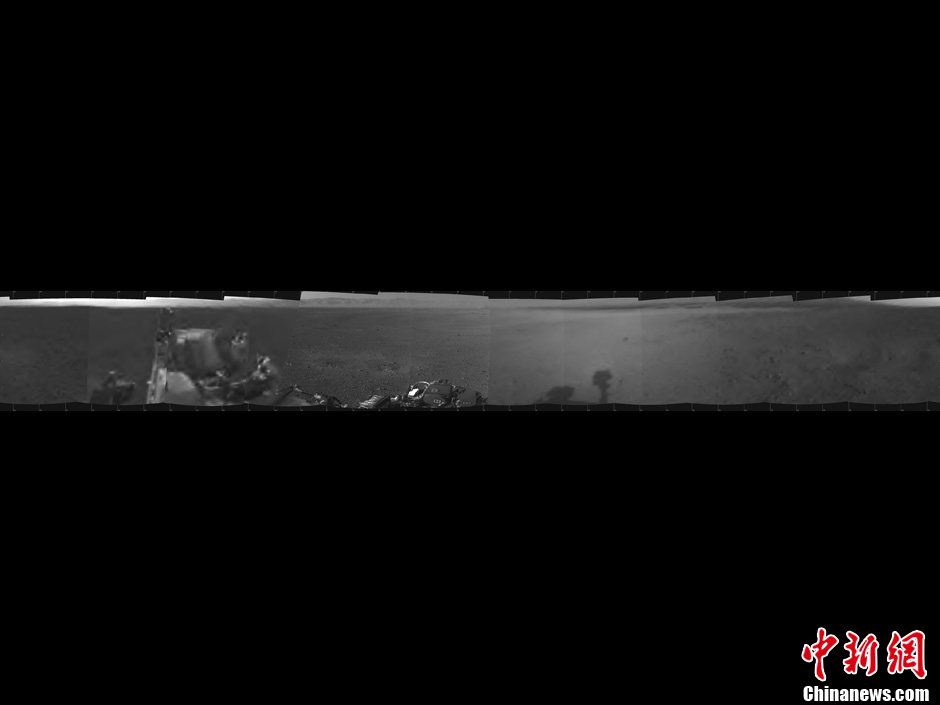 這是“好奇”號利用導航相機所拍照片繪制的第一幅360度全景圖。全景圖所使用的絕大多數照片都是縮略圖或者全分辨率照片的壓縮版,尚未傳回地球。處在全景圖中部附近的兩幅照片便是全分辨率照片。夏普山處在右側,蓋爾隕坑北側邊緣處在中央,“好奇”號處在前景,桅桿的影子處在右側。美國“好奇”號火星探測器于北京時間8月6日在火星成功著陸。圖片來源:NASA