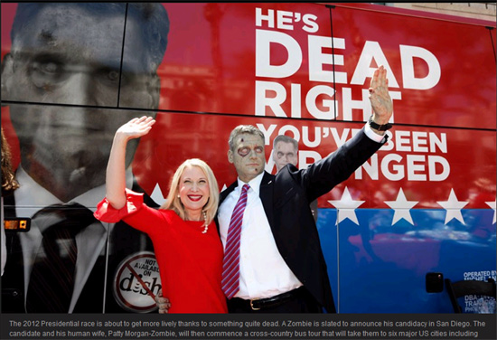 這位“僵尸”候選人已經在圣迭戈獲得候選人資格,他與人類妻子帕蒂·摩根-僵尸(Patty Morgan-Zombie)將開始全國公共汽車之旅,他們將首先前往美國6座城市,包括佛羅里達州的坦帕(Tampa)和北卡羅來納州的夏洛特,并向在此舉行共和黨大會和民主黨大會的兩大政黨發出支持“僵尸”的信息。