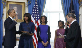 當地時間21日,美國總統奧巴馬在國會山公開宣誓就職美國總統,正式開始了他的第二個總統任期。整個就職典禮期間,至少有5名女保鏢的身影一路相隨左右。專家分析,美國白宮增加保護總統的女保鏢的人數,顯然和去年4月美國“總統保鏢”爆出在哥倫比亞召妓門的丑聞有關。