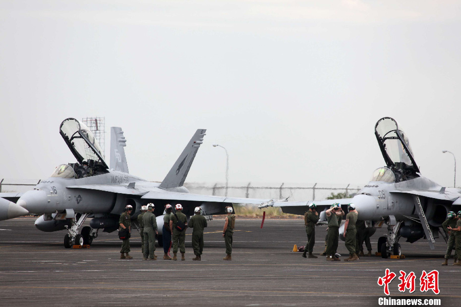 4月13日,菲律賓與美國“肩并肩”聯合軍事演習參演部隊在菲國北部的克拉克空軍基地對外展示參加本次軍演的飛機裝備。圖為當天停降在克拉克空軍基地內的多架美軍F/A-18戰斗機。中新社發 張明 攝