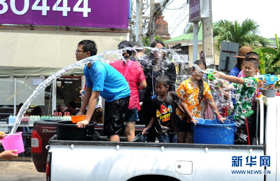 4月13日,在泰國北部城市清邁,幾名當地兒童在一輛皮卡車上潑水嬉戲。在清邁,男女老少傾城出動,用水槍、盆、桶等各種工具展開“潑水大戰”。