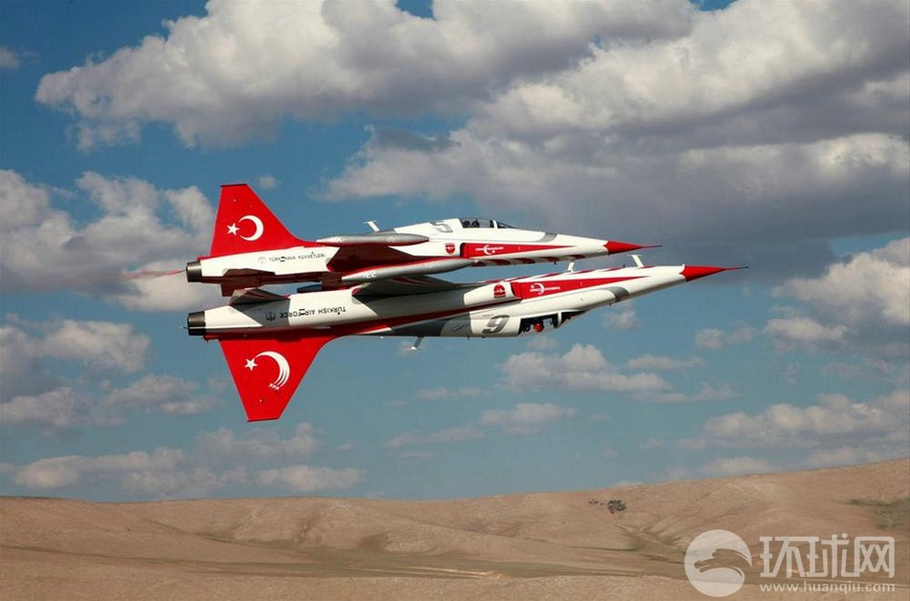 土耳其空軍“土耳其之星”飛行表演隊精彩表演。圖為土耳其空軍的“土耳其之星”特技飛行表演隊在空中做出“雙機靜像”特技動作。(來源:環球網)