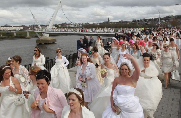 【環球網綜合報道】據英國《每日郵報》4月28日報道,750名來自英國各地的女性身著婚紗共同穿越位于德里的和平大橋,為臨終關懷院籌集資金。