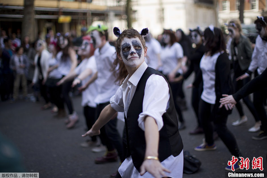 當地時間5月1日,英國倫敦,動物保護志愿者進行面部彩繪裝扮成動物“獾”,在英國環境、食品和農村事務部(DEFRA)外舉行示威集會并進行“快閃”,抗議剝取獾皮毛的行為。