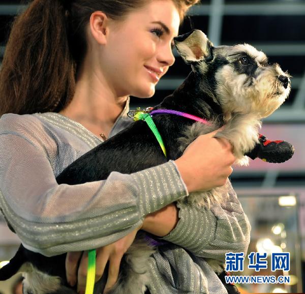 4月20日,一名模特在展示寵物狗的鞋。當日,為期4天的第26屆香港家庭用品展和第2屆香港國際家用紡織品展在香港會展中心開幕,活動現場舉辦了一場趣味十足的寵物飾品秀,吸引了眾多觀眾的目光。新華社記者 陳曉偉 攝