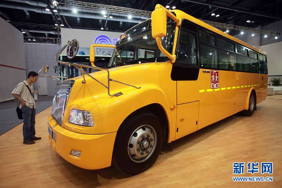 7月10日,觀眾在北京第二屆中國品牌汽車博覽會上觀看“大鼻子”校車。近日,一款黃色的“大鼻子”校車亮相在北京舉行的第二屆中國品牌汽車博覽會。該款校車在造型上借鑒了歐美校車的長頭設計,配備有專用停車信號臂、學童專用座椅、前后監護人座椅、前部補盲鏡等安全配置,提高了學生乘坐的安全性。新華社發(陳曉根 攝)