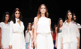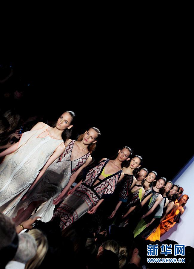 9月8日,在美國紐約舉行的梅賽德斯-奔馳紐約2012春夏時裝周上,模特展示BCBGMAXAZRIA品牌的服裝。梅賽德斯-奔馳紐約2012春夏時裝周當天開幕。本屆時裝周為期8天,將展示近百個品牌的2012春夏系列時裝。 新華社記者伍婧丹攝