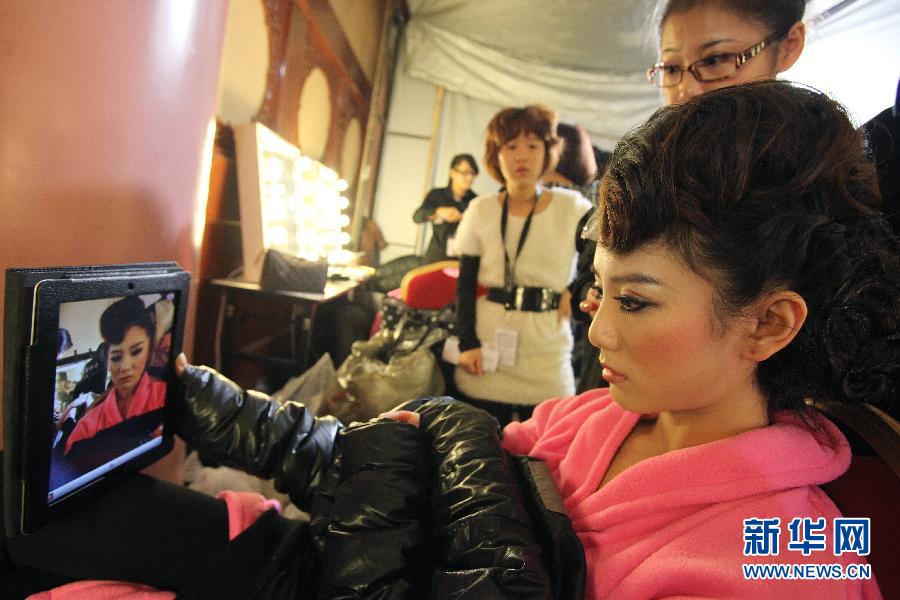 10月30日,在蔡美月2012春夏婚紗作品發布會開始前,模特在后臺拿著平板電腦實時觀看化妝效果。當日,中國國際時裝周蔡美月2012春夏婚紗作品發布會在北京飯店舉行。模特們提前4個小時就來到后臺,為T臺上的魅力瞬間做準備。新華社發(卓恩森 攝)