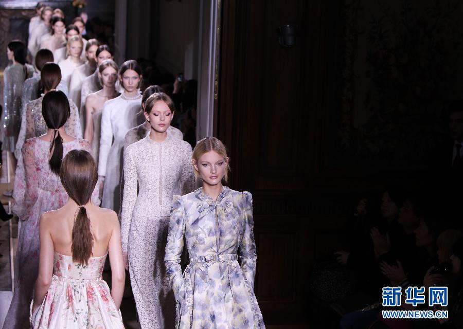 1月25日,模特在法國巴黎高級定制時裝周上展示意大利品牌華倫天奴(VALENTINO)2012/2013春夏新品。當日,為期3天的法國巴黎春夏高級定制時裝周落幕。 新華社記者高靜攝