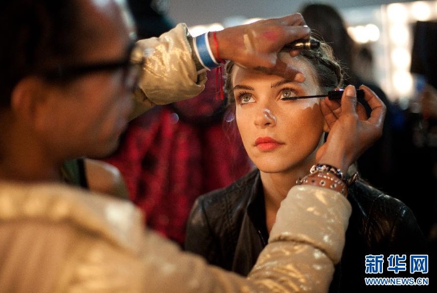 間,化妝師為模特化妝。 新華社/美聯