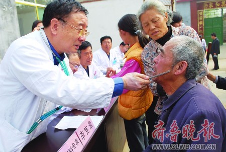 19日上午,由本報《今日運河》編輯部聯合濟醫附院、市慈善總會等單位發起的“健康大講堂”活動來到梁山縣。當天來自濟寧醫學院附屬醫院的醫療專家對當地鄉鎮基層的100多名婦產科醫護人員進行業務培訓,同時專家們還專門來到東平湖區——梁山縣館驛鎮開展愛心義診活動,并給鄉親們送去常用藥物。圖為:濟醫附院神經內科專家李憲章教授在給鄉親現場診治。