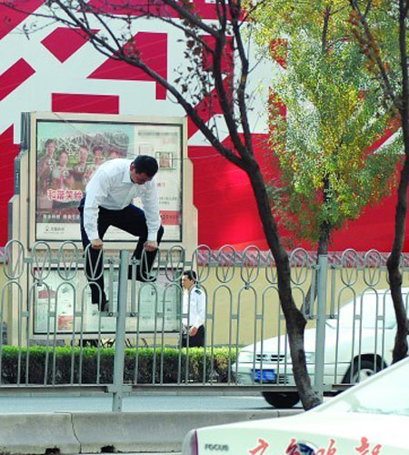 17日,一名男子在濼源大街艱難地翻越已經加高的護欄。為了杜絕行人翻越護欄,交警部門加高了濼源大街部分路段護欄,但仍有個別人舊習難改。翻越者跨過了護欄,卻丟掉了安全意識和社會責任。