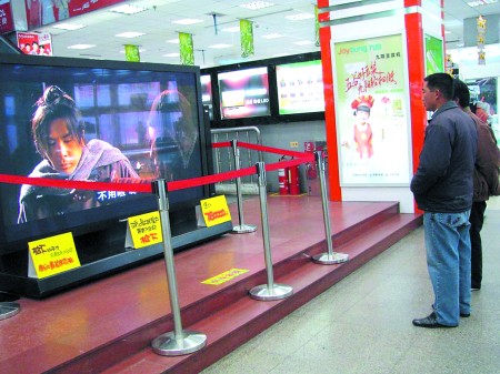 24日,泰安財(cái)源大街一家電商場擺出了一臺(tái)價(jià)值78萬的電視機(jī),廠家稱這是世界上最大的等離子電視。顧客爭睹天價(jià)電視芳容。 記者 王顏 攝影報(bào)道