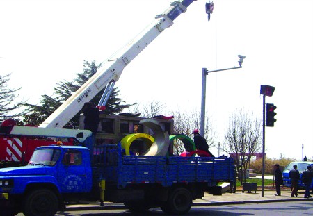4月1日,工作人員將位于延安三路與東海路交界處的奧運五環(huán)和倒計時牌拆除。隨著2008年北京奧運會的漸行漸遠,一些重要路段的奧運標志將逐漸拆除。 記者 劉大正 攝