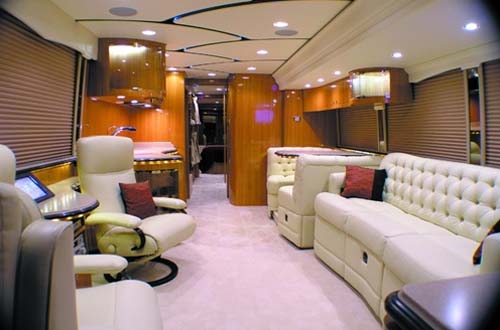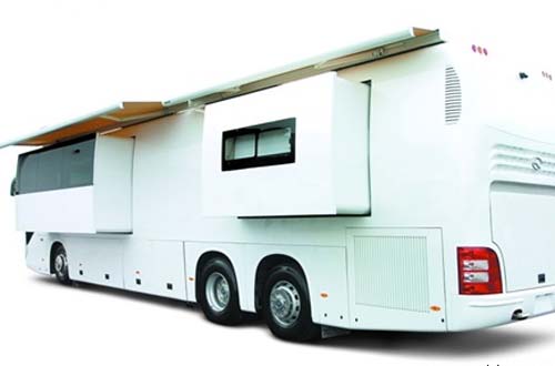 據(jù)悉,豪華房車(chē)的車(chē)廂長(zhǎng)為13.7米,達(dá)到了目前國(guó)內(nèi)客車(chē)標(biāo)準(zhǔn)的極限,寬2.55米,高3.96米,足以容納媲美頂級(jí)別墅的各種功能空間,細(xì)節(jié)設(shè)計(jì)中無(wú)處不體現(xiàn)著現(xiàn)代豪宅理念。房車(chē)的客廳內(nèi)擺放著高級(jí)真皮沙發(fā)、42英寸大屏幕液晶電視和五星級(jí)家庭影院音響系統(tǒng),酒吧內(nèi)藏滿(mǎn)美酒,廚房?jī)?nèi)微波爐、電磁灶、洗碗機(jī)、三門(mén)冰箱一應(yīng)俱全,可以在車(chē)上開(kāi)辦最出彩的家庭派對(duì)。房車(chē)的主臥配備了寬敞舒適的女王大床,旁邊是視野廣闊的美景大窗、備有專(zhuān)為女主人準(zhǔn)備的走入式衣櫥。寬敞的浴室?guī)в欣錈崴到y(tǒng),門(mén)前布置了華麗的梳妝臺(tái)和洗衣、干衣機(jī)。為進(jìn)一步拓展房車(chē)內(nèi)部空間,主臥和客廳都有一個(gè)大型滑移倉(cāng)可以向外滑移伸展。