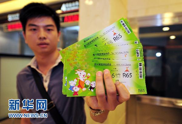 10月25日,一位購得亞運會籃球預選賽門票的市民在展示門票。廣州亞運會第三階段公眾門票銷售當天零時起正式啟動,廣州亞組委將公開銷售亞運會剩余的所有體育比賽門票,包括全部42個大項的55個分項、600余個比賽場次的體育比賽門票,大約一百萬張,銷售原則是“實時銷售、售完為止”。公眾可以通過中國工商銀行官方門票代售網點和廣州亞運會官方票務網站購買門票。新華社記者陳曄華攝