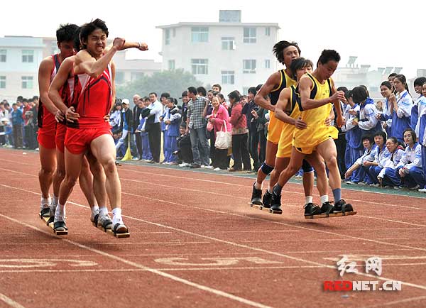 (板鞋,三人六腳共穿一雙長木鞋賽跑。)