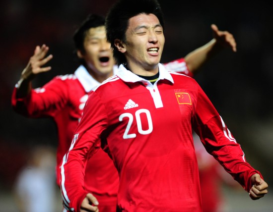 11月17日,中國隊球員楊旭(前)進球后慶祝。當日,在昆明舉行的一場足球熱身賽中,中國隊以1比0戰勝拉脫維亞隊。新華社記者秦晴攝