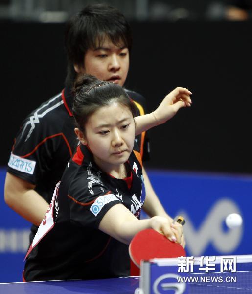 5月9日,日本選手岸川圣也(后)/福原愛在比賽中。當日,在荷蘭鹿特丹阿侯伊體育館舉行的2011年世界乒乓球(單項)錦標賽混雙首輪比賽中,岸川圣也/福原愛以4比0戰勝塞爾維亞選手茨雷普利亞/托多羅夫,晉級第二輪。新華社記者王麗莉攝