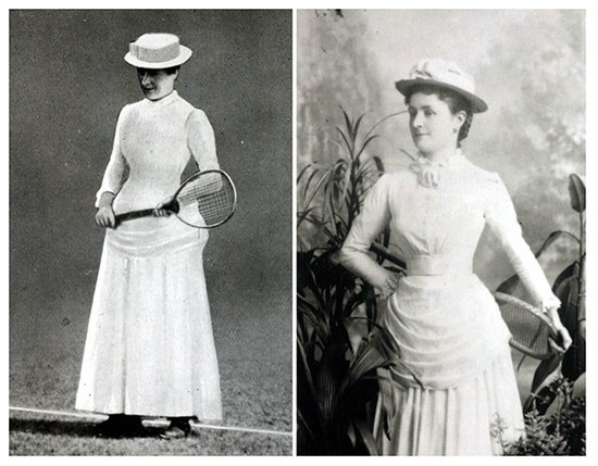Maud Watson (左邊) 打敗了她的妹妹Lilian (右邊) 成為1884年的網球比賽的冠軍,一件白色網球服可以更好地起到吸汗的效果。