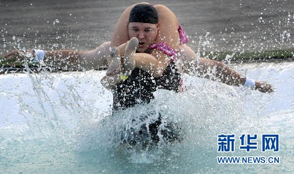 7月2日,在芬蘭松卡耶爾維舉行的世界背老婆錦標賽上,來自芬蘭的選手亞尼·云圖寧和亞納·哈維科參加疾跑比賽。 新華社/法新