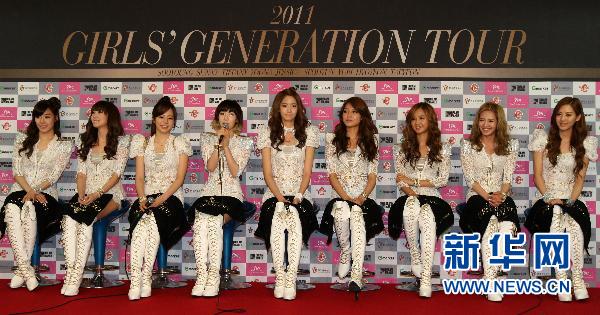 7月24日,在韓國首都首爾,韓國人氣組合“少女時代”的成員在首爾奧林匹克體育場出席“2011 GIRLS'GENERATION TOUR”演唱會的新聞發(fā)布會。 新華社發(fā)(樸真熙攝)
