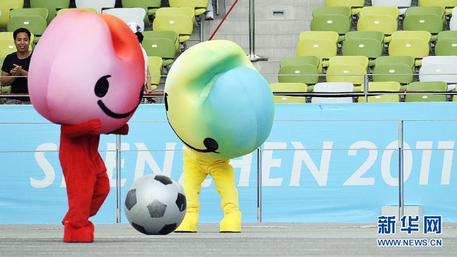 8月11日,UU在大運會足球賽場展示球技。當日,在第26屆世界大學生夏季運動會女足小組賽間歇,賽會吉祥物UU在場內大秀球技,受到現場觀眾的歡迎。 新華社記者王昊飛攝