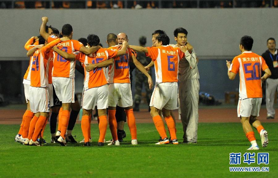 10月19日,山東魯能隊球員慶祝勝利。當日,在2011中國足協(xié)杯半決賽中,山東魯能隊在主場通過點球大戰(zhàn),以4比3戰(zhàn)勝北京國安隊,晉級決賽。 新華社記者徐速繪攝