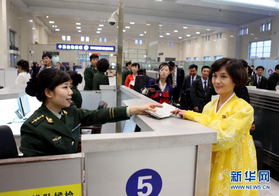 10月21日,丹東邊防檢查站工作人員為朝鮮血海歌劇團演員辦理通關手續。 當日,朝鮮血海歌劇團《梁山伯與祝英臺》劇組約180名演員應邀來華進行為期近三個月的巡演。他們乘坐專列從丹東口岸入境,丹東邊防檢查站開啟“綠色檢查通道”,保證劇組人員順利通關。根據中國民間傳說改編的朝鮮歌舞劇《梁山伯與祝英臺》將從10月下旬起在北京、上海、廣州、長春、沈陽等城市亮相。 新華社發(吳瓊 攝)